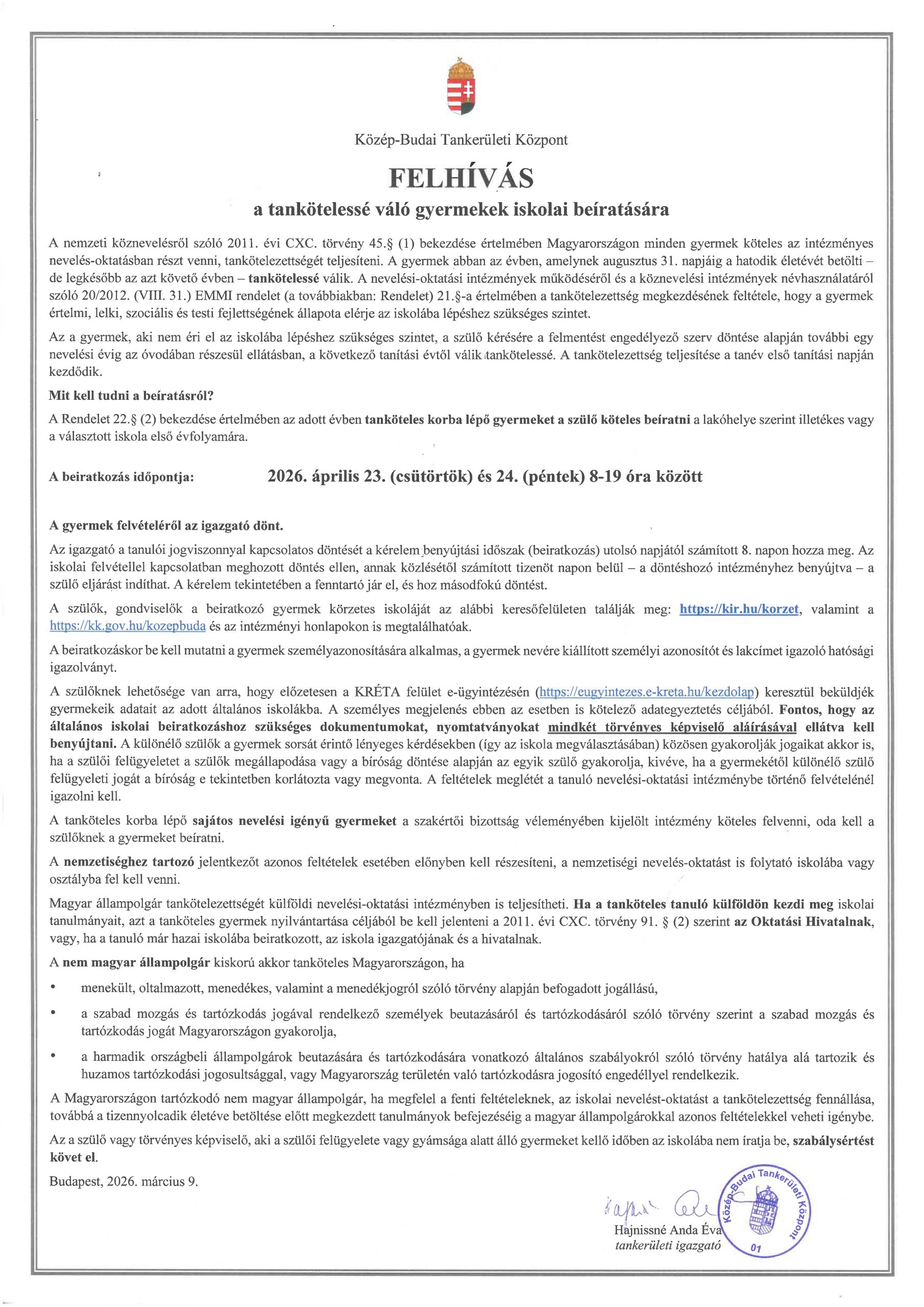 Az általános iskolai beiratkozáshoz szükséges dokumentumokat, nyomtatványokat mindkét törvényes képviselő aláírásával ellátva kell benyújtani.